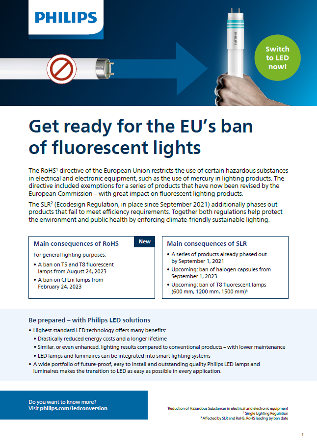 Dne 24. února 2022 byla v Úředním věstníku Evropské unie zveřejněna aktualizace směrnice RoHS. Zavedené změny budou mít velmi významný dopad na trh s osvětlením a nabídku tradičních světelných zdrojů. Současná povolení pro použití rtuti v lineárních zářivkách (fluorescenčních lampách?) a neintegrovaných kompaktních zářivkách (fluorescenčních lampách?) vyprší v roce 2023 a nebudou obnovena. To znamená, že tyto výrobky nesmějí být uváděny na evropský trh: